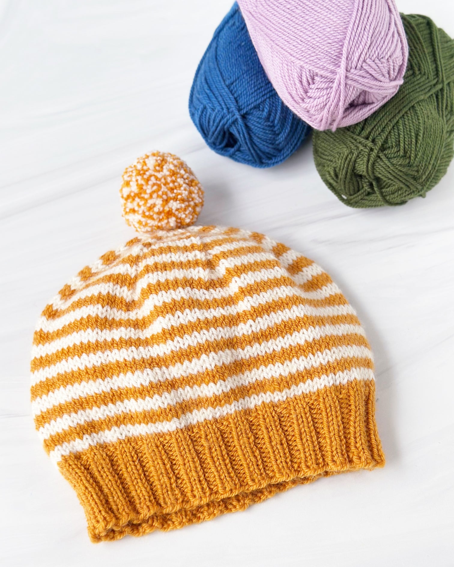 Knit in buttery-soft Ewe So Sporty merino, this is the perfect project to master simple color changes and finish with a playful, oversized pom-pom.