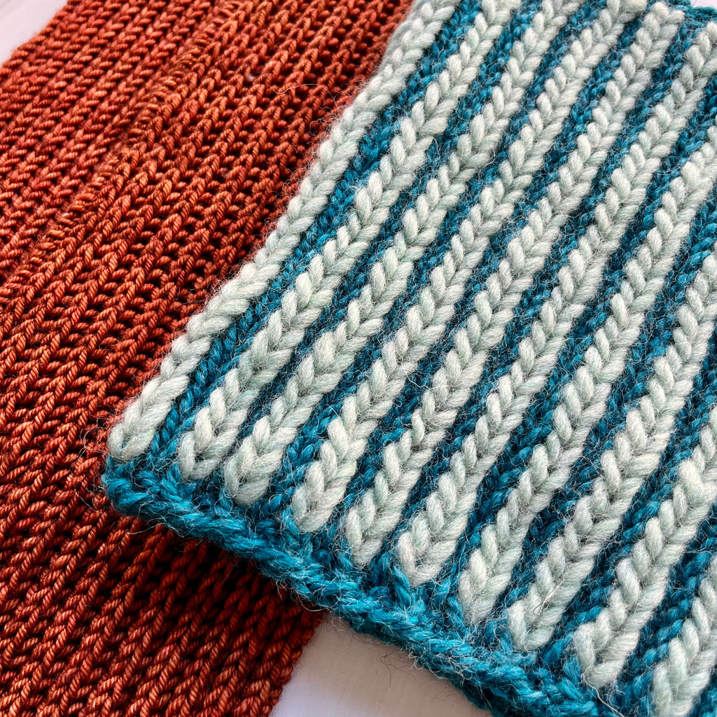 Materials:For a 1-color brioche scarf, you'll need 300 yards of worsted weight yarn and US 8 needles. For a 2-color cowl, you'll need 100 yards of 2 colors of bulky yarn and a US 10.5 16-inch circular.