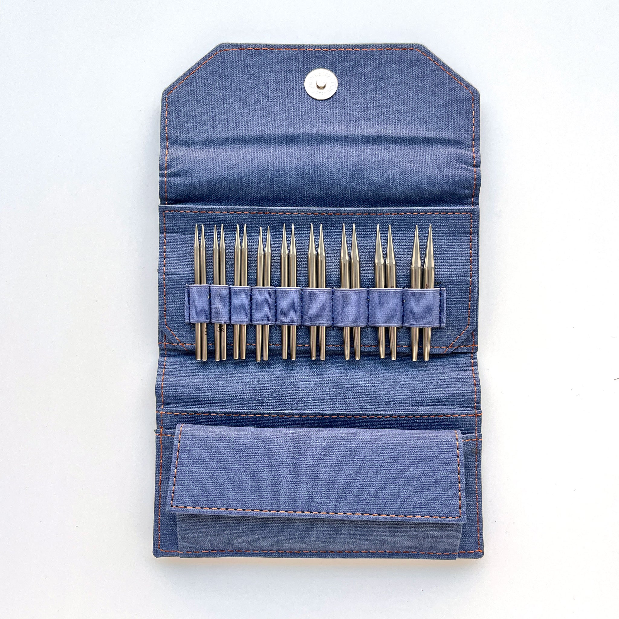 Each set includes 9 pairs of needles, sizes US 3-US 10.5, 1 each braided steel cord in 16", 20", 24", 32", 4 keys, 2 cord connectors, and 8 stoppers, all in a waxed denim-look case. Please note that the braided steel cords only work with these needle sizes.