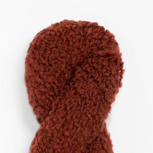 This is such a gorgeous yarn. The brick color is just amazing in person, so rich. As a beginner knitter it is a little hard to read your stitches because of the boucle so I wouldn't use it for your first project, but it's worth working up to!