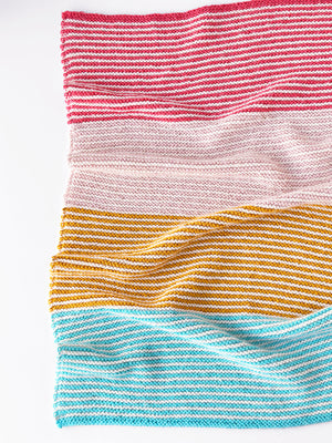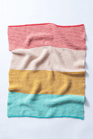 The Seaside Blanket Kit is a soft, cheerful baby blanket that’s as soothing to knit as it is to snuggle. Simple garter stitch stripes create gentle texture and clean lines, while the fresh color palette feels playful, modern, and easy to love in any nursery.